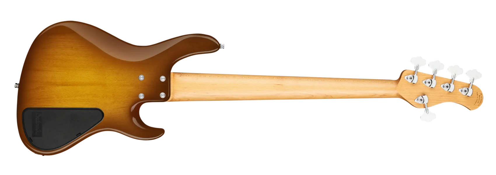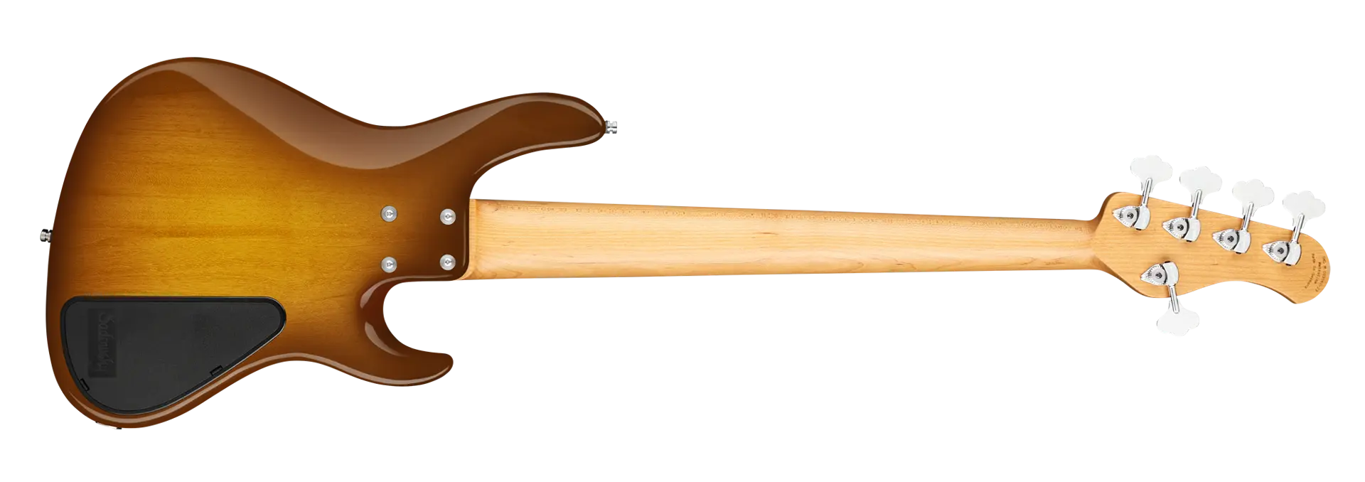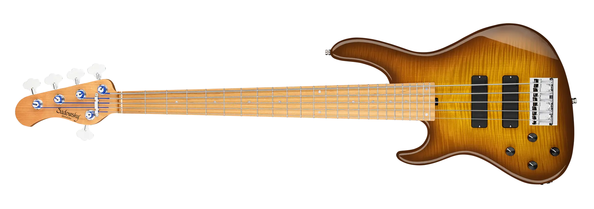 Der Sadowsky MetroLine Deluxe 24-Fret Modern Bass ist perfekt für alle Spieler, die einen Bass in moderner Optik und dem berühmten Sadowsky-Ton suchen: Niemals harsch oder schrill klingend, mit starken, kraftvollen, aber nie matschigen Bässen, mit präsenten, aber nicht zu aggressiven Mitten und einem süßen und luftigen Höhenbereich. Der 5-saitige Linkshänder-Bass hat einen Korpus aus Okoume (chambered). Hier in einer Caramel Burst Transparent High Polish-Lackierung zu sehen, ist die Korpusform schlank und unterdimensioniert mit tieferen Cutaways für bessere Bespielbarkeit und einen vollen Tonumfang von zwei Oktaven. Der Hals ist aus geröstetem amerikanischem Ahorn gefertigt und hat ein geröstetes amerikanisches Ahorn Griffbrett mit 24 Neusilberbünden. Dieser Bass ist mit zwei passiven Sadowsky Soapbar-Tonabnehmern ausgestattet, beide in moderner Position, und verfügt über eine aktive Elektronik, die True Bypass, Vintage Tone Control sowie Treble- und Bass-Boost bietet. Die Hardware umfasst Sadowsky Light Open Gear Mechaniken und eine Sadowsky Quick String Release Brücke. Jeder Sadowsky MetroLine Deluxe 24-Fret Modern Bass wird ausschließlich in unserer Werkstatt in Deutschland gefertigt und wiegt nicht mehr als 4,0 kg. Eine gute Wahl für Bassisten, die auf der Suche nach einem leichten, modern aussehenden Bass mit dem speziellen modernen Sadowsky-Sound sind.