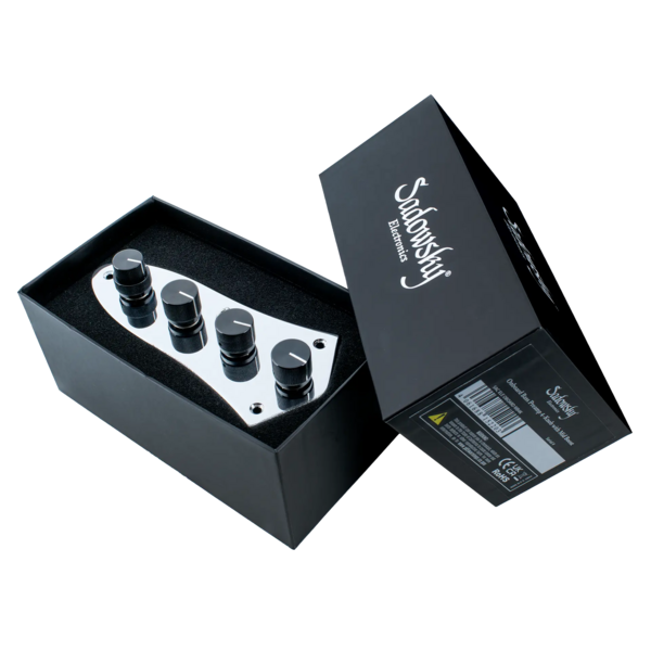 Der Sadowsky Onboard Bass Preamp (4-Knob System) ist ein vorverdrahtetes System, das die gleichen Regelmöglichkeiten und den legendären aktiven Vorverstärker wie alle Sadowsky-Bässe bietet. Der Preamp ist für die Installation in den meisten Bässen im J-Style mit einer Control Plate aus Metall ausgelegt. Bei neueren aktiven Modellen im J-Style mit einer seitlichen Ausgangsbuchse und einem Batteriefach sind normalerweise keine Änderungen erforderlich. Bei passiven Instrumenten besteht die einzige erforderliche Änderung darin, die Ausgangsbuchse zur Seite des Instruments zu verlegen und Platz für eine Batterie zu schaffen. Die Regelmöglichkeiten sind: Volume – Pan (Balance) – VTC (Vintage Tone Control) – Treble / Bass – Mid Boost Schalter. Die Bass- und Höhen-Regler boosten ausschließlich - dreht man die Regler komplett nach links erhält man einen linearen Frequenzgang. Der Preamp bietet darüber hinaus eine 500 Hz Mittenanhebung, die über einen Kippschalter zugeschaltet werden kann. Der VTC-Regler arbeitet passiv, die maximale Einstellung ist ein Flat-EQ. Je weiter man den Regler zurückdreht, desto stärker werden die Höhen im Signal gedämpft. Der Preamp kann wahlweise mit der Control Plate oder durch ein Elektronikfach montiert werden. Dieses System ist nicht mit aktiven Tonabnehmern kompatibel, die etwas anderes als einen 250K oder 500K Volume- oder Balance-Poti benötigen.
