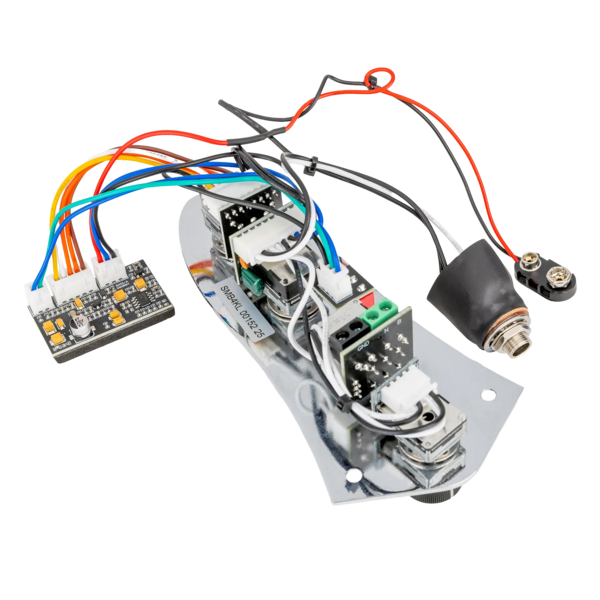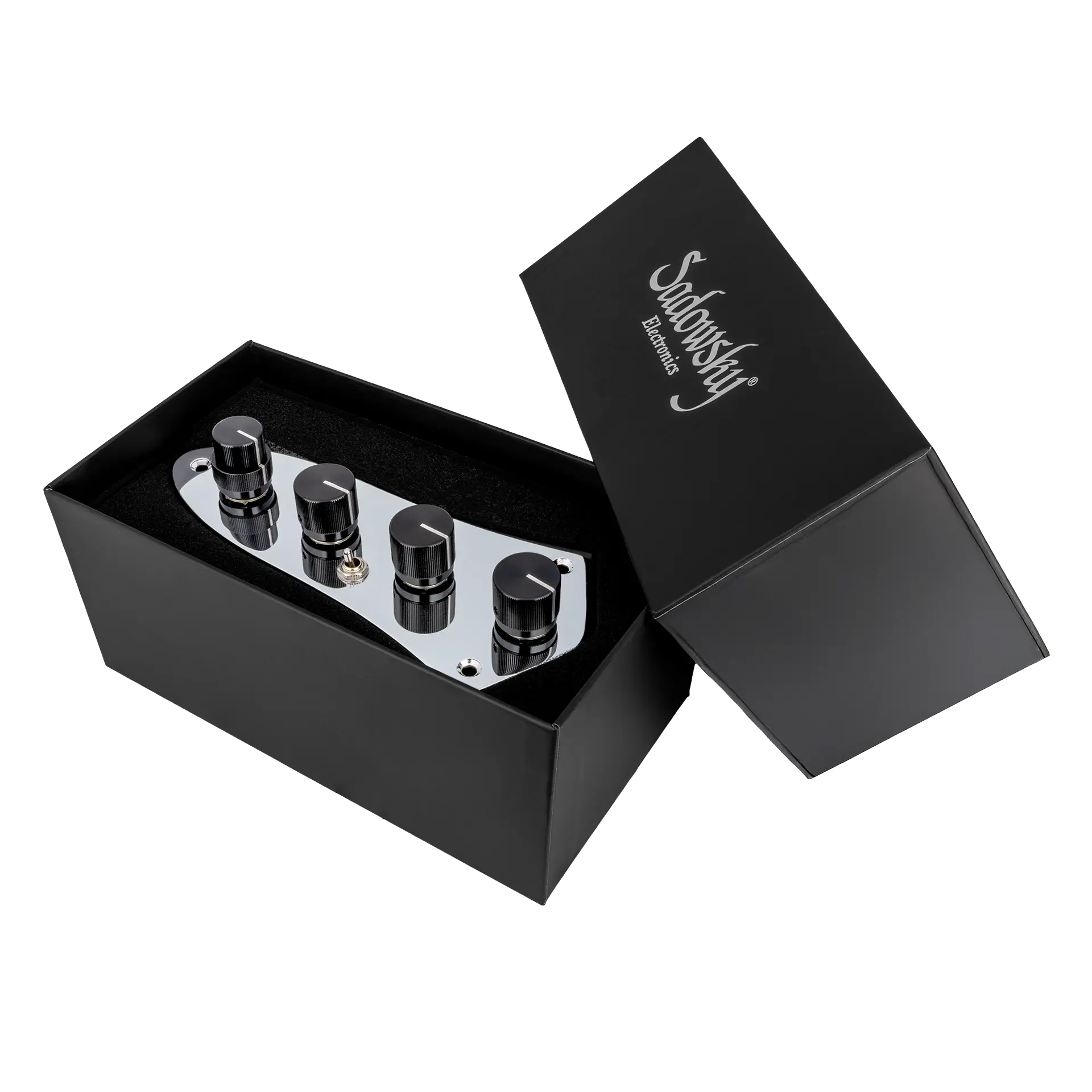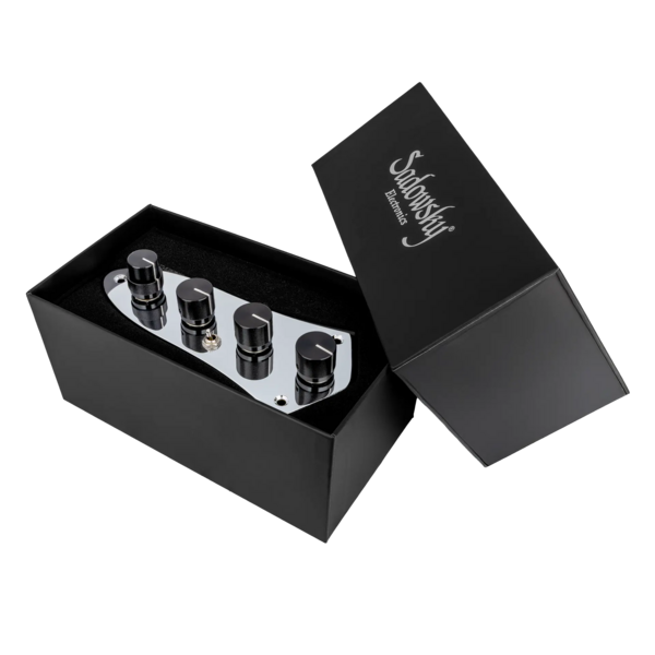 Der Sadowsky Onboard Bass Preamp (4-Knob System) ist ein vorverdrahtetes System, das die gleichen Regelmöglichkeiten und den legendären aktiven Vorverstärker wie alle Sadowsky-Bässe bietet. Der Preamp ist für die Installation in den meisten Bässen im J-Style mit einer Control Plate aus Metall ausgelegt. Bei neueren aktiven Modellen im J-Style mit einer seitlichen Ausgangsbuchse und einem Batteriefach sind normalerweise keine Änderungen erforderlich. Bei passiven Instrumenten besteht die einzige erforderliche Änderung darin, die Ausgangsbuchse zur Seite des Instruments zu verlegen und Platz für eine Batterie zu schaffen. Die Regelmöglichkeiten sind: Volume – Pan (Balance) – VTC (Vintage Tone Control) – Treble / Bass – Mid Boost Schalter. Die Bass- und Höhen-Regler boosten ausschließlich - dreht man die Regler komplett nach links erhält man einen linearen Frequenzgang. Der Preamp bietet darüber hinaus eine 500 Hz Mittenanhebung, die über einen Kippschalter zugeschaltet werden kann. Der VTC-Regler arbeitet passiv, die maximale Einstellung ist ein Flat-EQ. Je weiter man den Regler zurückdreht, desto stärker werden die Höhen im Signal gedämpft. Der Preamp kann wahlweise mit der Control Plate oder durch ein Elektronikfach montiert werden. Dieses System ist nicht mit aktiven Tonabnehmern kompatibel, die etwas anderes als einen 250K oder 500K Volume- oder Balance-Poti benötigen.
