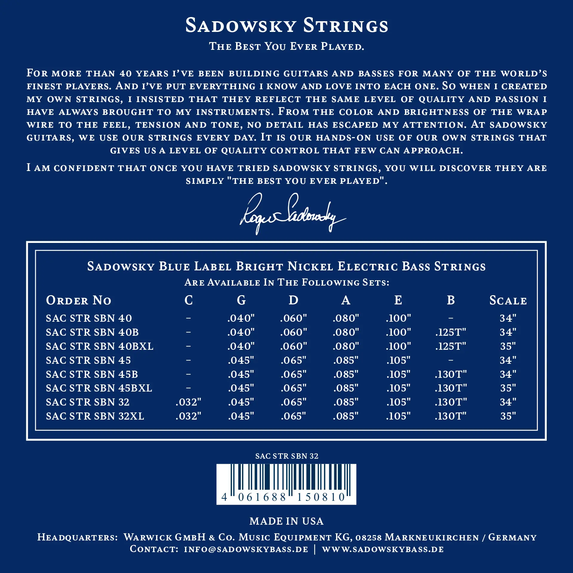 Sadowsky Blue Label Bass String Set, Nickel, Taperwound, Long Scale (34") - 6-String, .032-.130