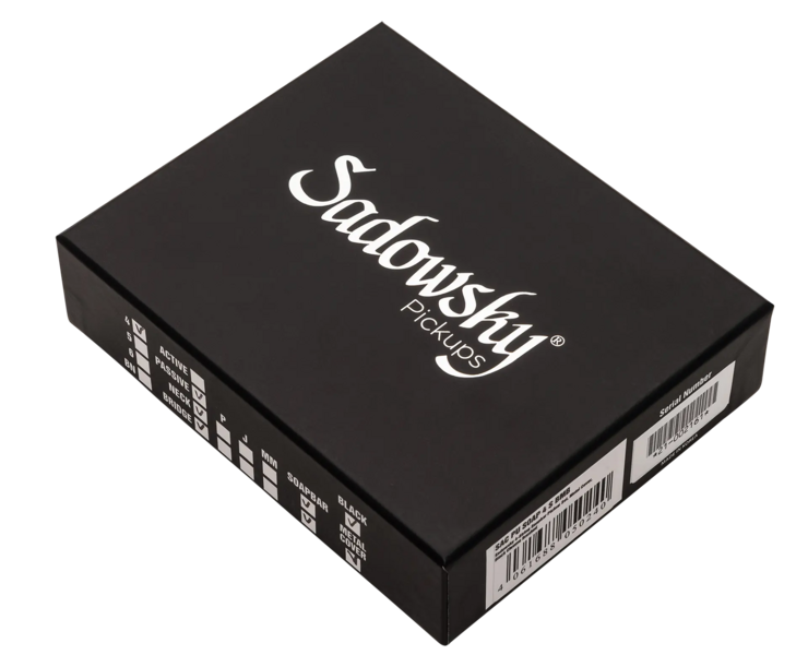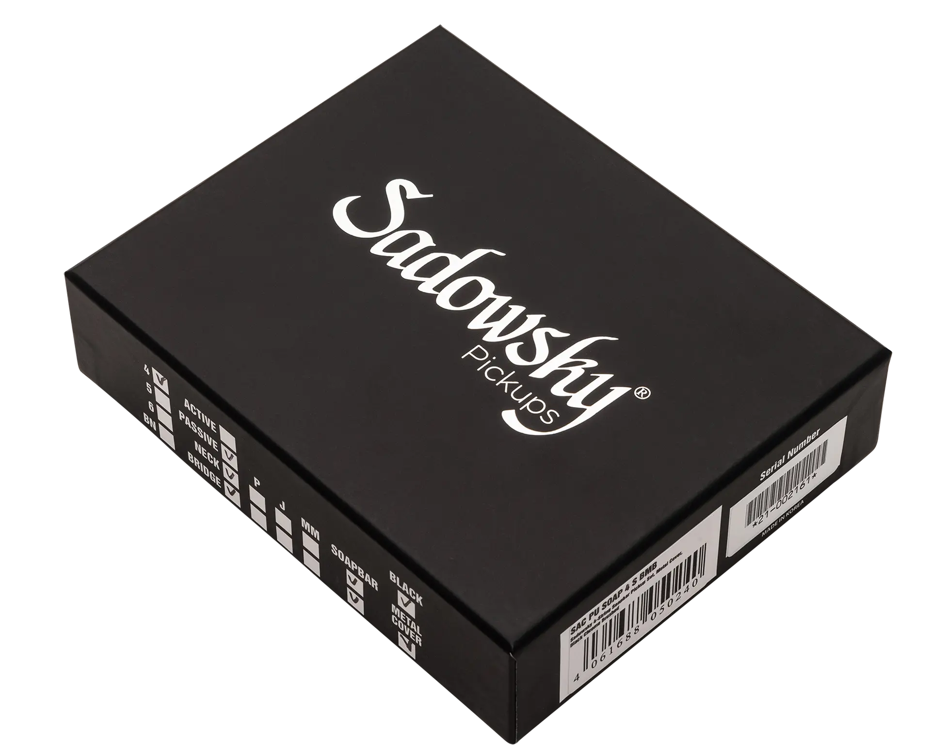 Passives Sadowsky Dual-Coil Soapbar Humbucker Bass Pickup Set (Hals und Steg) für 4-saitige Bässe. Enthält sowohl den Hals- als auch den Stegtonabnehmer (SAC PU SOAP 4 N BMB und SAC PU SOAP 4 B BMB). Zu den Merkmalen gehören in Reihe geschaltete Spulen, abgeschirmtes, 2-adriges Anschlusskabel, Ferrit Magnet mit Stahlklingen und eine gebürstete Metallabdeckung in Black Chrome.